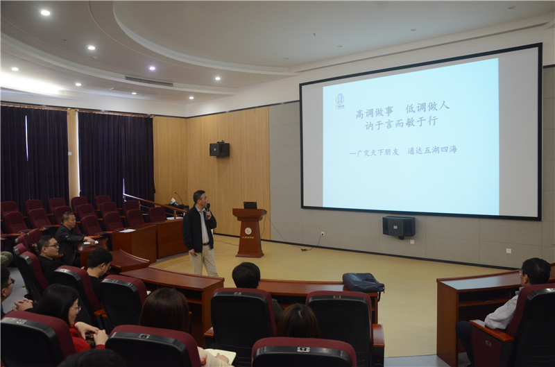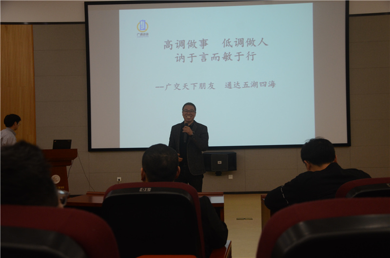 首先,广通公司王冰波副总经理作了《高调作事 低调做人》的主题讲座。王总指出,高调做事,就是要善做大事,敢做难事,勇做急事,会做小事。他引用毛主席的话,解说“低调做人”的含义,就是做一个高尚的人,做一个纯粹的人,做一个有道德的人,做一个脱离了低级趣味的人,做一个有益于人民的人。