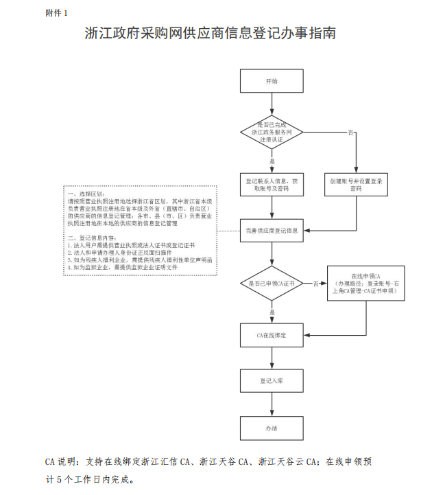 (一)凡符合政府采购法规定条件的供应商,均可在浙江政务服务网(含市场监督管理主管部门平台,下同)完成身份认证,获得登录名及密码,即可通过浙江政府采购网,按要求完善登记相关信息后,获得线上政府采购活动操作权限。供应商无法在浙江政务服务网完成身份认证的,可通过浙江政府采购网“浙江政府采购供应商信息登记管理系统”直接进行信息登记,获得相应权限。供应商参加电子卖场、项目电子化交易活动的,还应按规定程序领取 CA 证书。办事指南详 见附件 1。