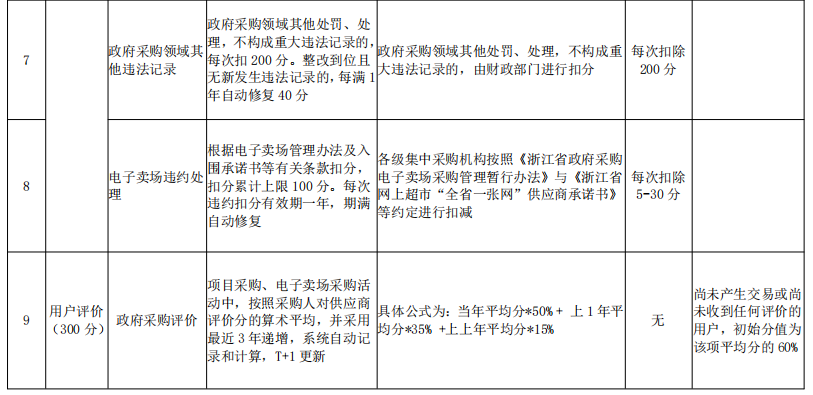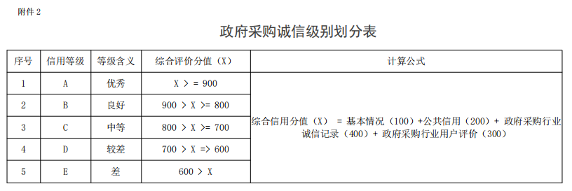 (一)浙江省政府采购供应商按统一标准设置“政府采购诚信分”,总分为 1000 分,由基本情况、公共信用情况、诚信记录和用户评价等一级指标组成,一 级指标下各设若干个二级指标。政府采购诚信分为 A、B、C、D、E 五个级别,其中A 级为政府采购红名单。政府采购诚信级别划分和诚信分计算标准详见附件 2、 3,并将根据运行情况不定期更新,同步公布于浙江政府采购网。