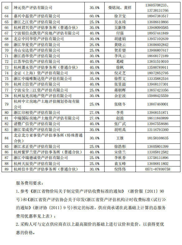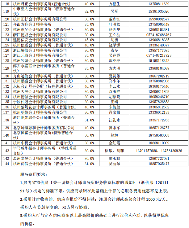 浙江浙经天策会计师事务所有限公司等144 家单位为本次会计、审计等小额中介服务的入围机构;杭州恒升资产评估有限公司等 89 家单位为本次资产评估服 务的入围机构(供应商名单、联系方式和承诺优惠率详见附件 1、2)。服务协议 期限自《2021-2022 年度省级网上服务市场会计、审计服务(定点采购)项目框架 协议》或《2019-2020 年度省级网上服务市场资产评估服务(定点采购)项目框架协议》(范本详见附件 3、4)生效之日起至 2022 年 12 月 31 日止。