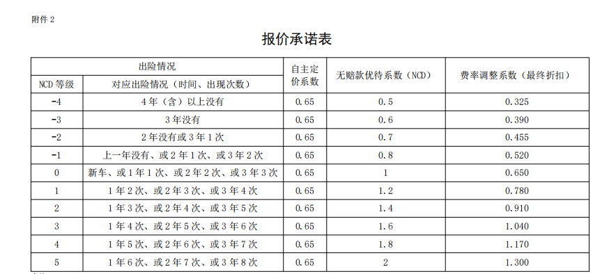 2.费率调整系数=无赔款优待系数×自主定价系数 x 交通违法系数(说明:浙江地区交通违法系数取 1)。 3.无赔款优待系数根据车辆实际出险情况和连续投保年度历史赔款记录,按照无赔款优待系数对照表进行费率调整。由行业主管部门或行业协会统一制定颁布,由行业平台自动返回。