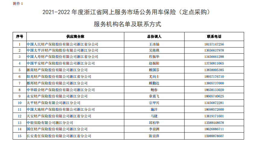 1.2021-2022 年度浙江省网上服务市场公务用车(定点采购)服务机构名单及联系方式