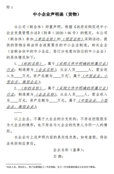 第十一条 中小企业参加政府采购活动,应当出具本办法规定的《中小企业声明函》(附 1),否则不得享受相关中小企业扶持政策。任何单位和个人不得要求供应商提供《中小企业声明函》之外的中小企业身份证明文件。